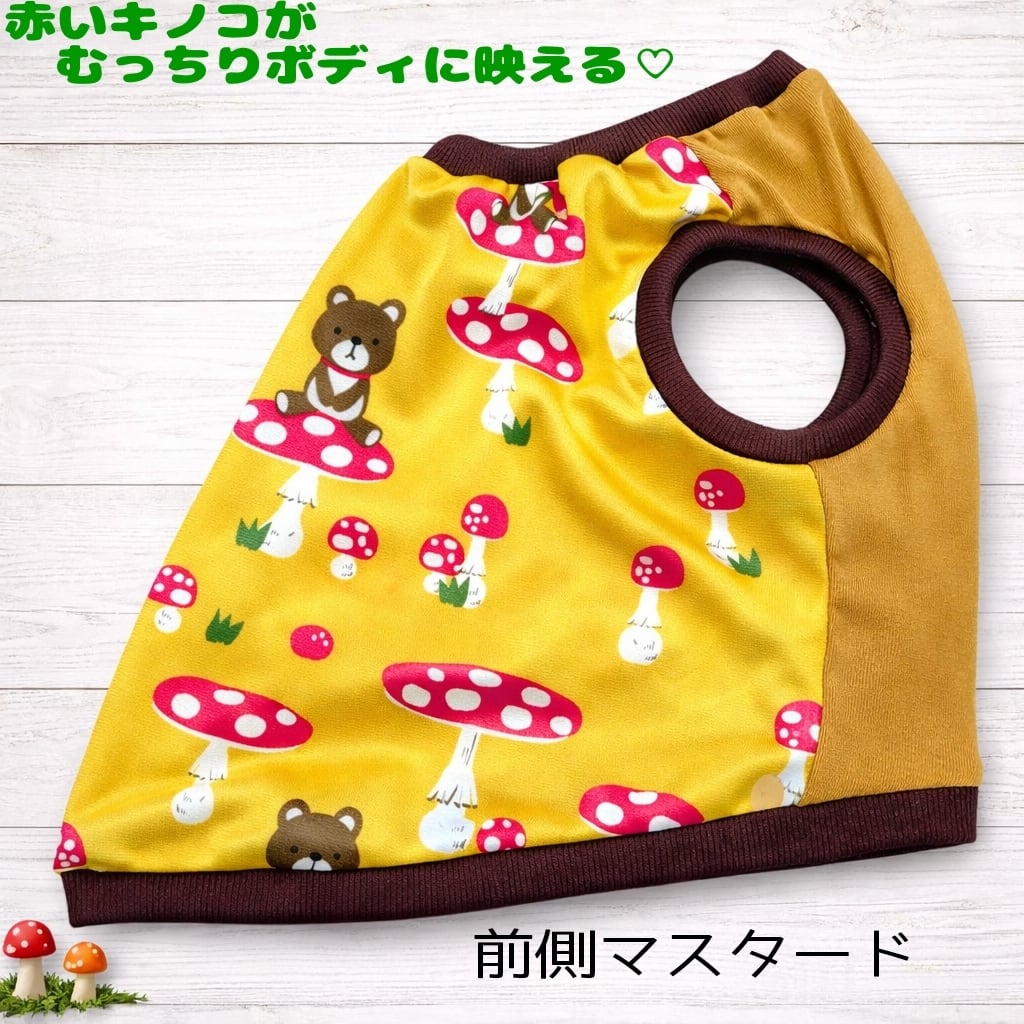 イエローオークルの生地にベニテングダケと襟巻きの赤が映える大人可愛いくまちゃん柄です♡